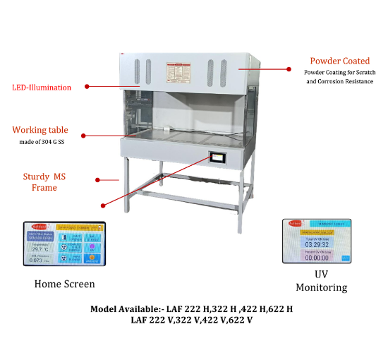 | Construction | Transparent acrylic & UV-flexi glass panels, stainless steel worktable, washable pre-filters. |